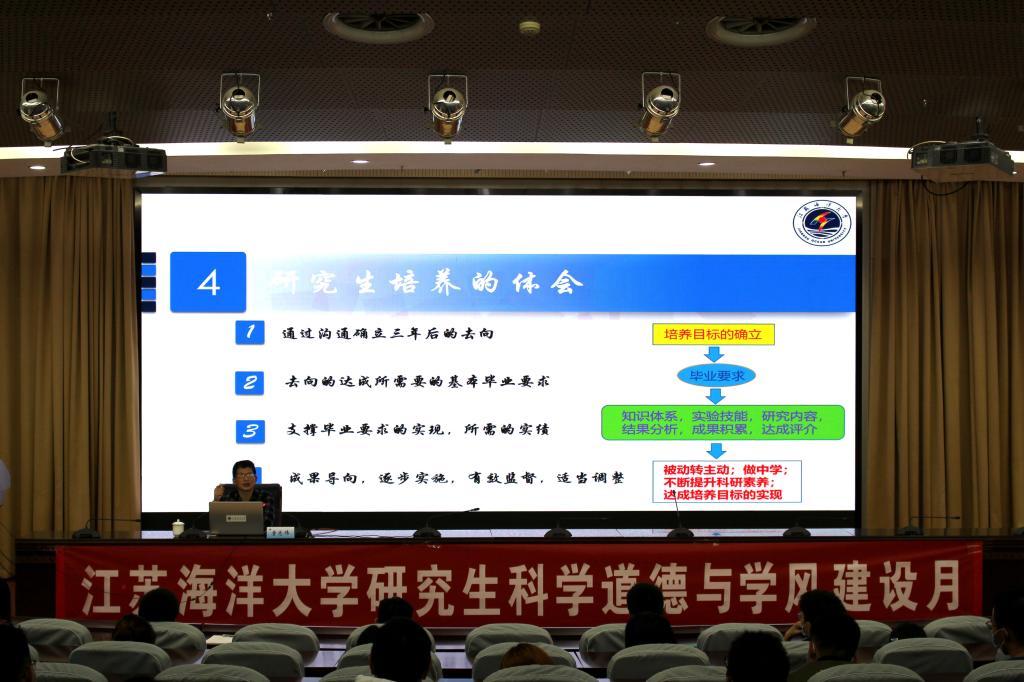 11月3日下午,江苏海洋大学研究生讲坛第二讲“弘扬科学家精神,恪守学术道德”在会议中心黄海厅举行,原环境与化学工程学院院长童志伟教授向研究生介绍了如何促进“科学研究素养的养成”。本次讲座采用线上线下相结合的形式展开,近200名研究生参加现场活动。讲座由党委研究生工作部部长、研究生院院长卢霞主持。