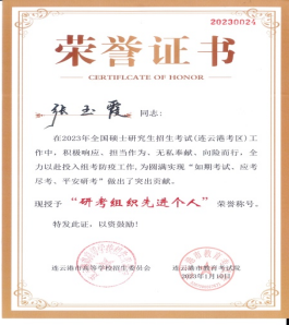 近日,连云港市教育考试研究院下发表彰通报,对2023年全国硕士研究生招生考试(连云港考区)研考组织先进个人进行表彰,我校盘赛昆、丁建江、周海、张玉霞4位同志被评为连云港市“研考组织先进个人”。