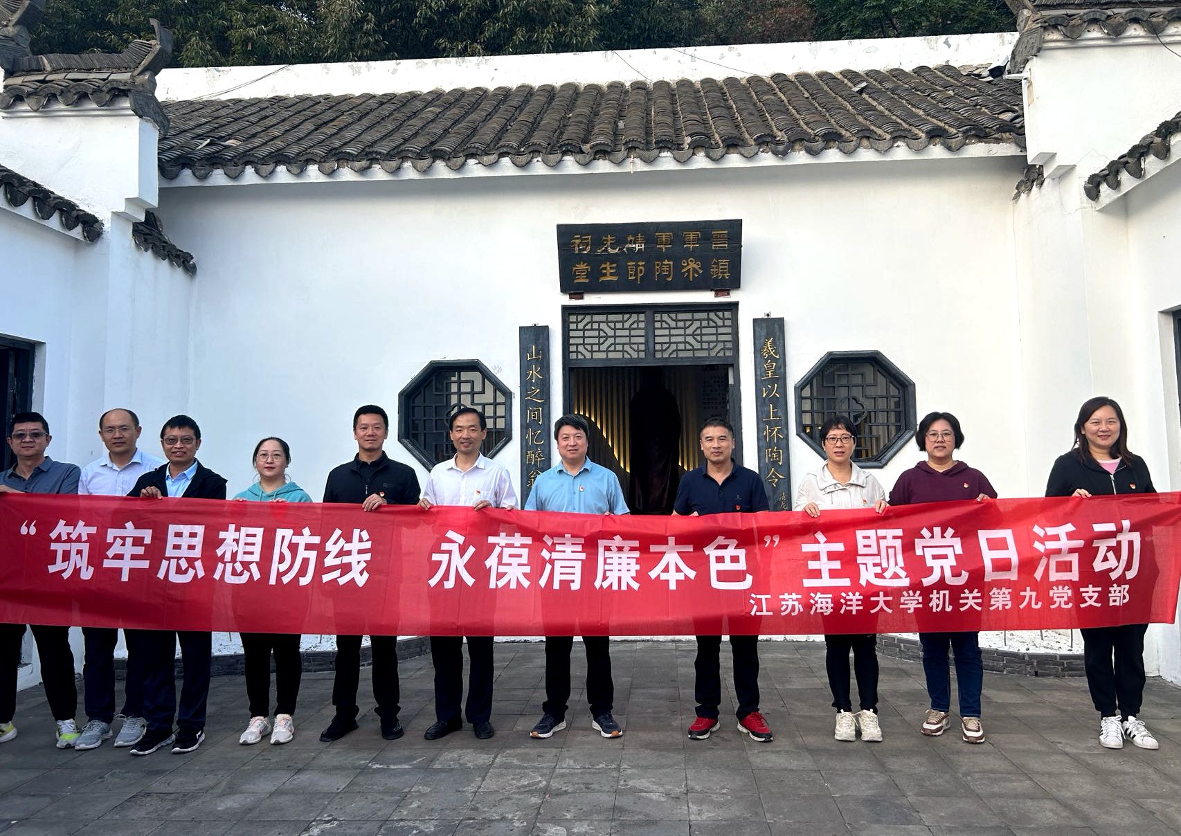 共建仪式后,机关第九党支部组织全体党员赴陶渊明文化园开展廉政教育参观学习。党员们跟随着讲解员的步伐,细细品味晋代诗人陶渊明廉洁齐家、守正不阿、勤政为民的故事,感受一代文豪淡泊名利、安贫乐道的思想和追求,实地接受了陶渊明注重家风、廉洁自律、坚持原则等清廉守节思想洗礼。大家纷纷表示,在今后工作中,时刻牢记党的宗旨,认真学习宣传贯彻中国共产党江苏海洋大学第一次党员代表大会精神,严守纪律底线,做到心中有党、心中有民、心中有责、心中有戒,履职尽责,在建设高水平应用研究型海洋大学的征程上自觉践行忠诚、干净、担当,展现机关干部职工良好形象。(伏晓姝/文 周冶/图 机关第九党支部)