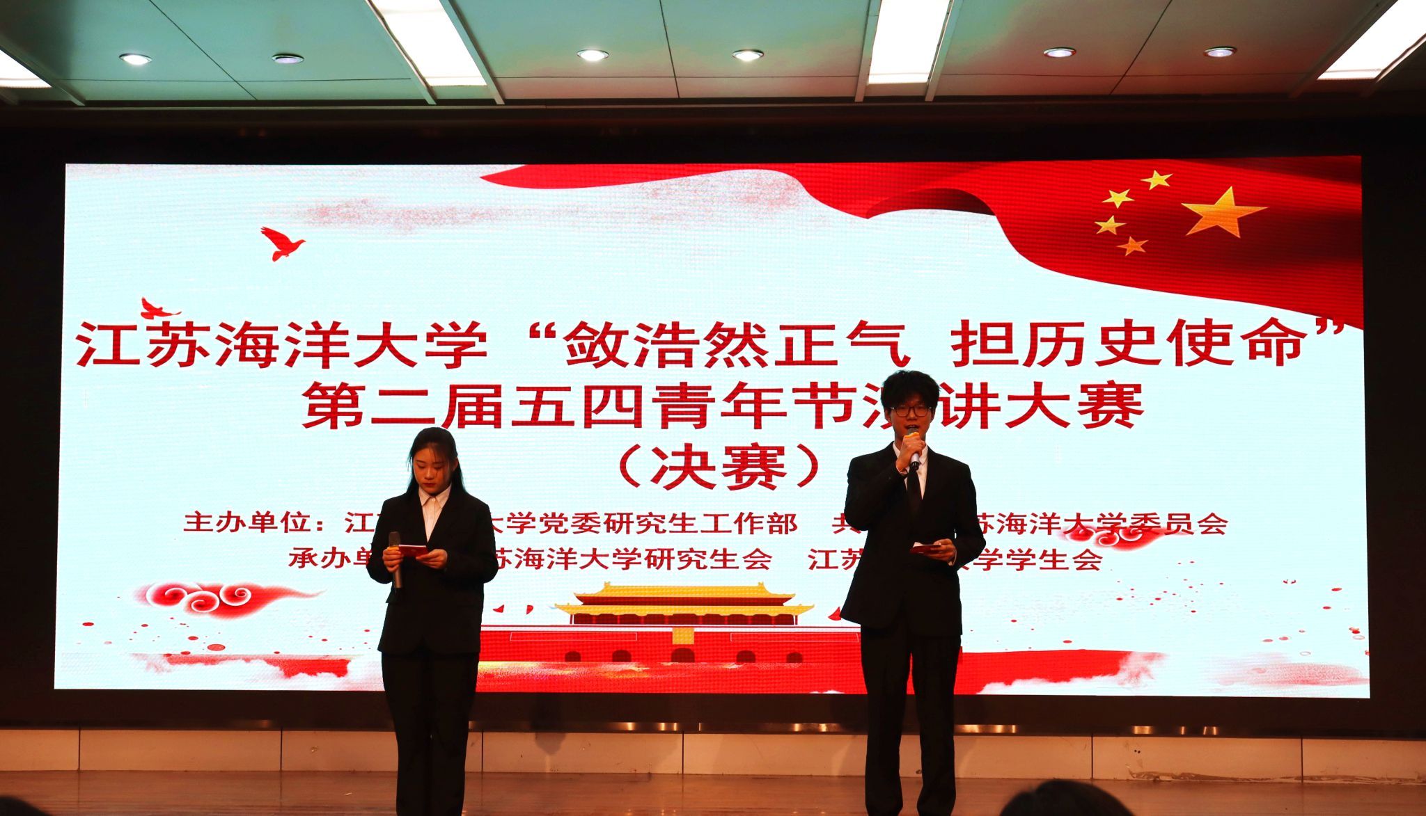 为引导广大学生积极投身社会主义现代化建设,在实现中华民族伟大复兴中国梦的征程中展现青春风采,为祖国繁荣富强贡献自己的力量,4月29日晚,由党委研究生工作部、共青团江苏海洋大学委员会主办,校研究生会、校学生会承办的“敛浩然正气,担历史使命”第二届五四青年节演讲大赛决赛在艺术楼报告厅举行。研究生培养学院辅导员代表、江苏海洋大学研究生会和学生会主席团成员代表担任评委。部分青年教师、研究生和本科生代表到场呐喊助威。