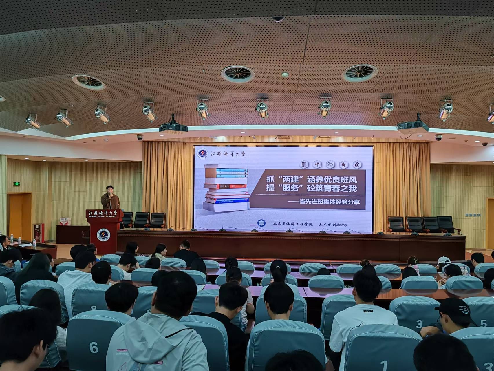 江苏省”先进班集体”——土木与港海工程学院土木水利研究生2021班班长梁帅作为代表以《抓“两建”涵养优良班风 提“服务”砼筑青春之我》为题进行分享,介绍了班级建设的经验和成果,强调了班级凝聚力和集体荣誉感培育的重要性,认为一个团结、积极向上的班集体能够为同学们提供良好的学术氛围和精神支持。该班是一个团结、进取的集体,班风、学风优良,科研成果丰硕,共计发表论文20篇,其中SCI论文5篇、北大中文核心2篇、省级期刊共13篇;获得专利共计37项,其中发明专利共授权11项、实审19项、实用新型专利共授权7项;研究生为主持人立项课题项目共计5项;班级荣获集体荣誉共计8个,其中国家级1个、省级3个、校级2个、院级2个;学生个人荣誉19项,其中省级荣誉9项、市级荣誉3项、校级荣誉7项;英语四级通过率86.84%(400分以上100%)、六级通过率44.74%;积极参加社会实践及志愿服务,其中“聚焦农房 赋能安全”社会实践团队荣获“2022年江苏省社会实践优秀调研报告”、江苏省研究生社会实践和志愿服务“十佳研究生团队”提名奖,“我当‘鲁班’来诊断 智能鉴定宜居行”实践团队荣获“2023年江苏省社会实践优秀团队”等,多名同学荣获连云港市海州区疫情防控优秀志愿者和校疫情防控优秀志愿者;积极开展社会主义核心价值观教育、科学道德与学术规范教育活动,成效显著;班级成员在校、院、班担任学生干部达到29人次。