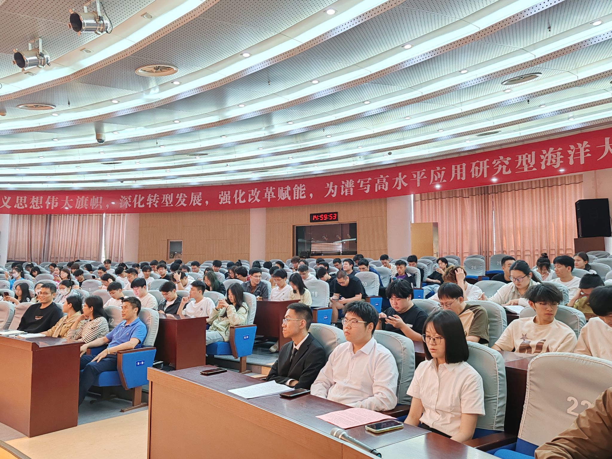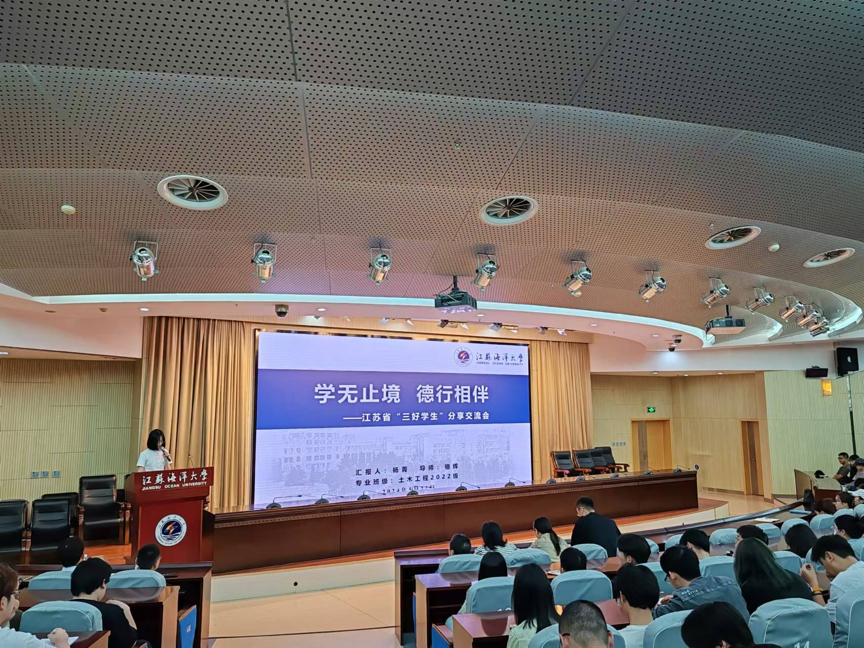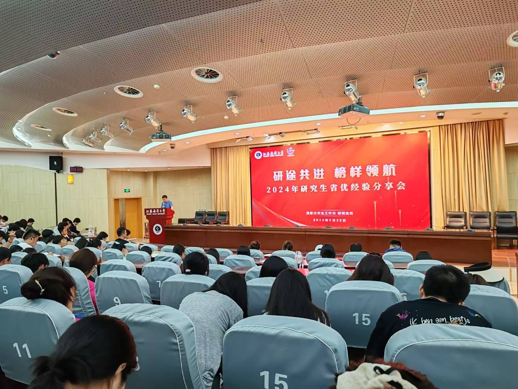为加强我校研究生学风建设,发扬朋辈榜样的示范引领作用,5月22日下午,校党委研究生工作部、研究生院在会议中心黄海厅召开“研途共进 榜样领航”2024年研究生省优经验分享会,此次活动也是第二届“海洋嘉年华”系列活动之一。我校获得省“三好学生”、“优秀学生干部”、“优秀毕业生”称号的4名研究生和省“先进班集体”代表进行了经验分享,党委研究生工作部、研究生院相关同志及各研究生培养学院的研究生辅导员、200余名研究生代表一并参加。
