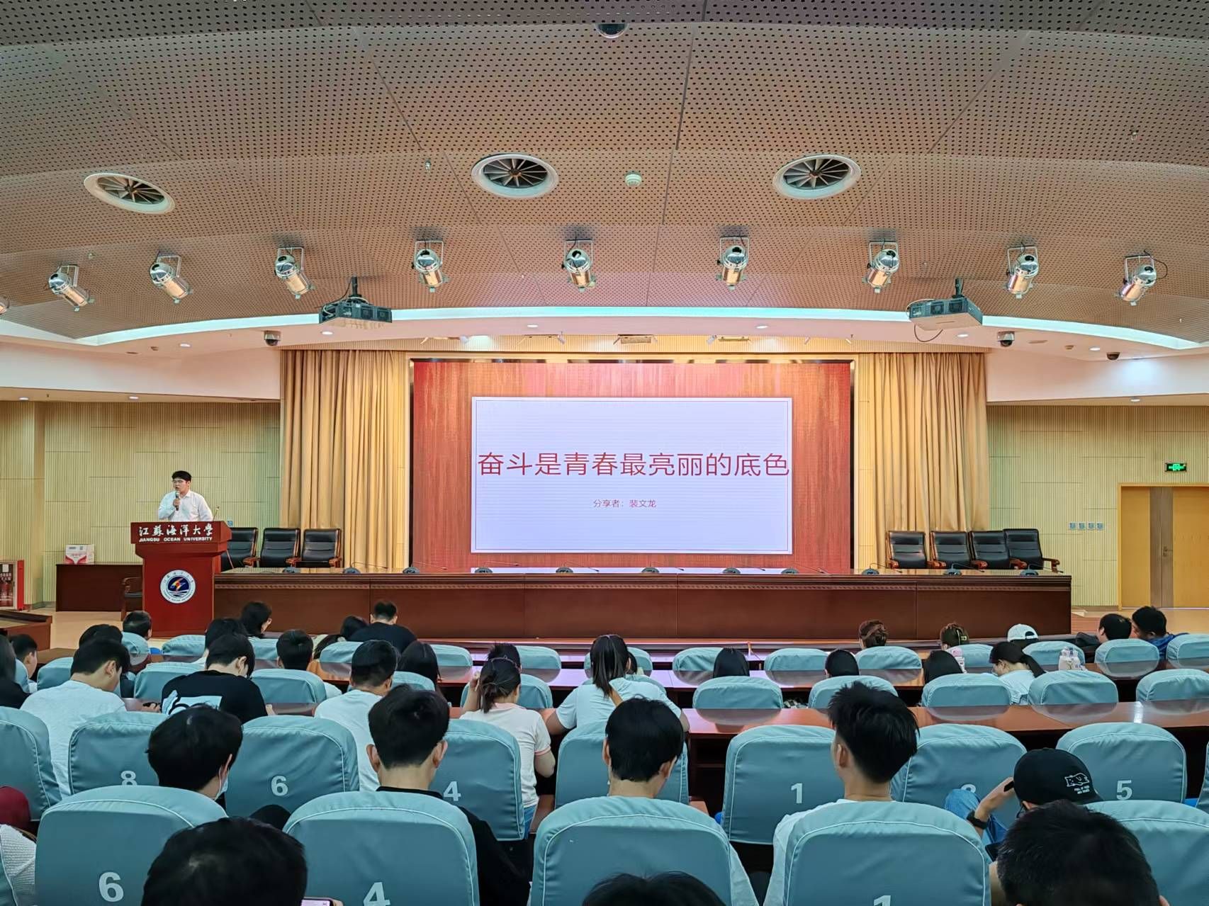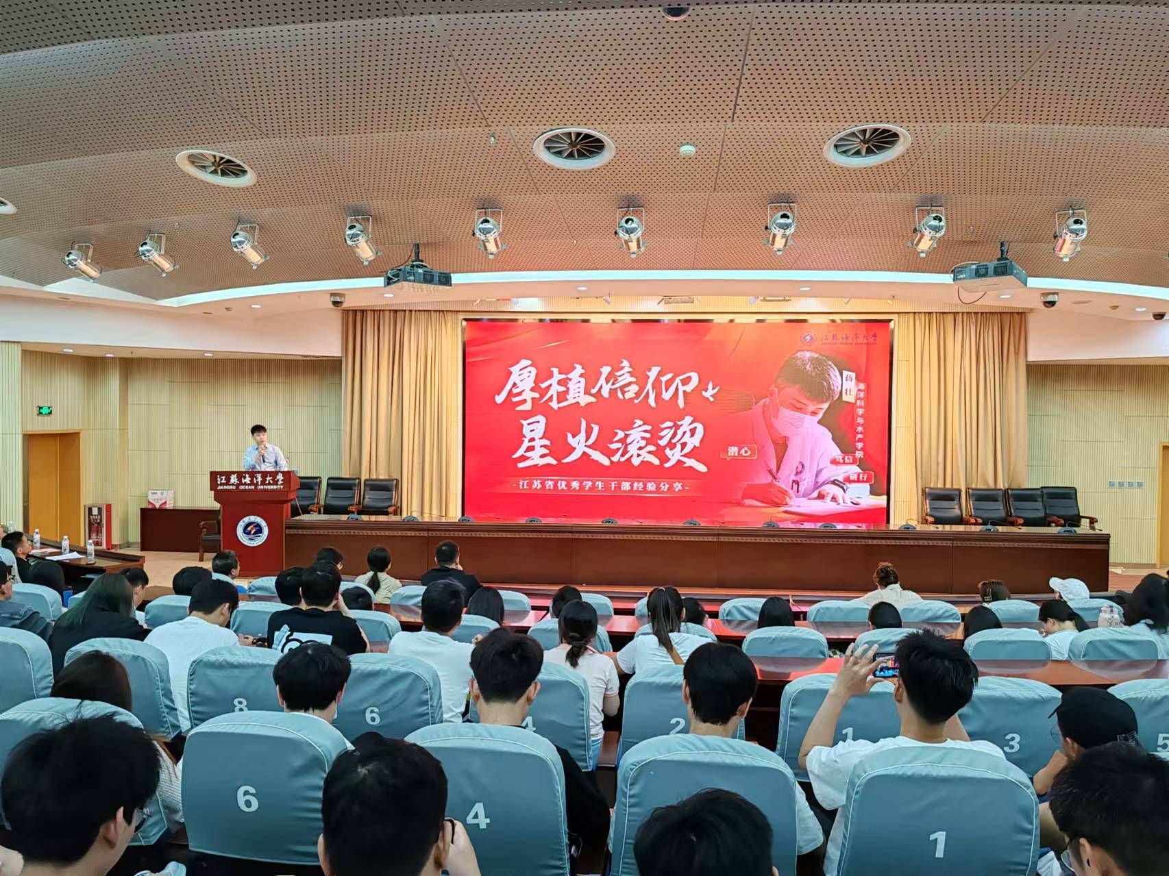 江苏省“优秀学生干部”称号获得者——海洋科学与水产学院2022级研究生蒋壮以《厚植信仰 星火滚烫》为题,从“故事起源——思想篇”“砥砺研思——学习篇”“实干笃行——实践篇”三个方面分享自己入伍、学习科研、社会实践和志愿服务的经历和心得,重点讲述了自己担任学生干部的经历和体会,强调了团队合作、责任担当的重要性,作为学生干部,要时刻关注同学们的需求,积极为大家服务,同时也要摆正位置,不断提升自己的组织协调能力和沟通能力,做到事事有回应,成为有担当有作为的学生干部。该生目前担任校研究生会主席团成员、海洋科学与水产学院研究生会主席团成员和研究生第二党支部宣传委员,荣获发明专利实审4项、二等学业奖学金1次、三等学业奖学金1次,以及2023年江苏省第二届社会实践与志愿服务十佳研究生提名奖、2024年校“优秀研究生干部”、2022年徐州市丰县疫情防控优秀志愿者等殊荣8项,第三届全国大学生数据分析科普竞赛一等奖等学科竞赛4项以及志愿服务证书多项。