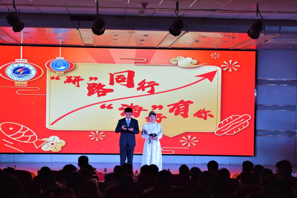 2019年12月28日晚上7点,以“‘研’路同行,‘海’好有你”为主题的2019级研究生迎新晚会在艺术楼报告厅成功举办。流光溢彩迎元旦,心心连新齐飞扬,在研究生会全体成员的精心布置下,晚会现场到处弥漫着欢乐的气氛。出席晚会的嘉宾有党委研究生工作部副部长、研究生处副处长秦海波老师以及校研究生会第五届骨干成员们。