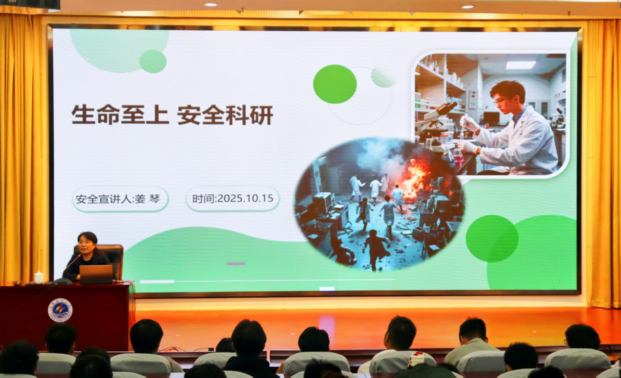 随后,姜琴副教授作《生命至上 安全科研》实验室安全专题报告,围绕实验窒事故规律简析、实验室安全管理规范、事故预防与应急处置、实验室安全文化创建等四个方面系统地介绍实验室安全操作提示,通过数据解读、案例警示与实操指导,全面提升研究生实验室风险防控与应急能力。