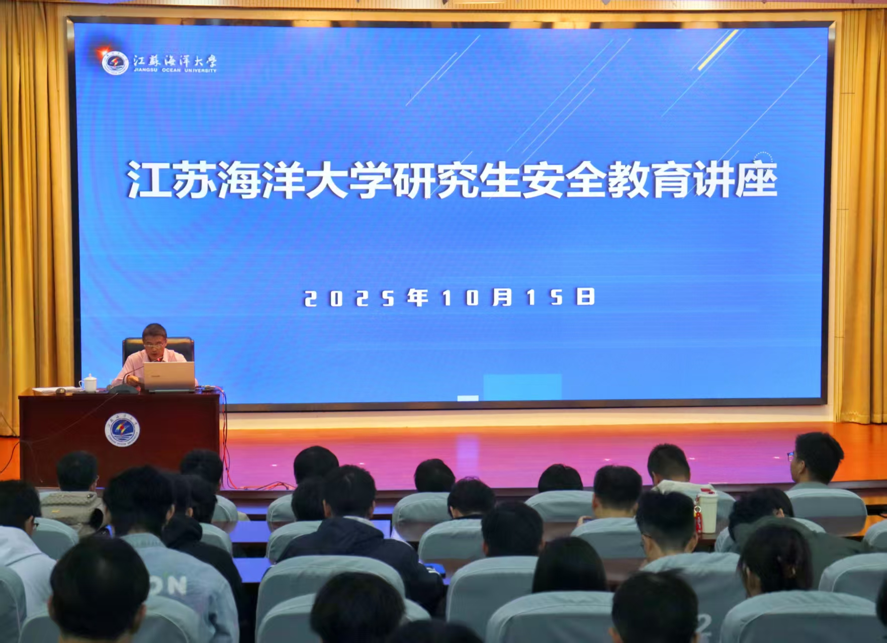 10月15日下午在学校会议中心黄海厅,党委研究生工作部、研究生院组织开展研究生“严守安全底线,赋能学术攀登”主题安全教育,邀请连云港市海州公安分局郁洲派出所任海洋副所长、我校环境与化学工程学院研究生导师姜琴副教授2位嘉宾为研究生新生讲授开学“安全第一课”。旨在增强研究生法治观念和安全意识,提升研究生安全风险辨识、防控和应急处置能力,促进平安校园建设。共有来自15个研究生培养单位的270余名研究生代表参加,讲座由党委研究生工作部副部长、研究生院副院长秦海波主持。